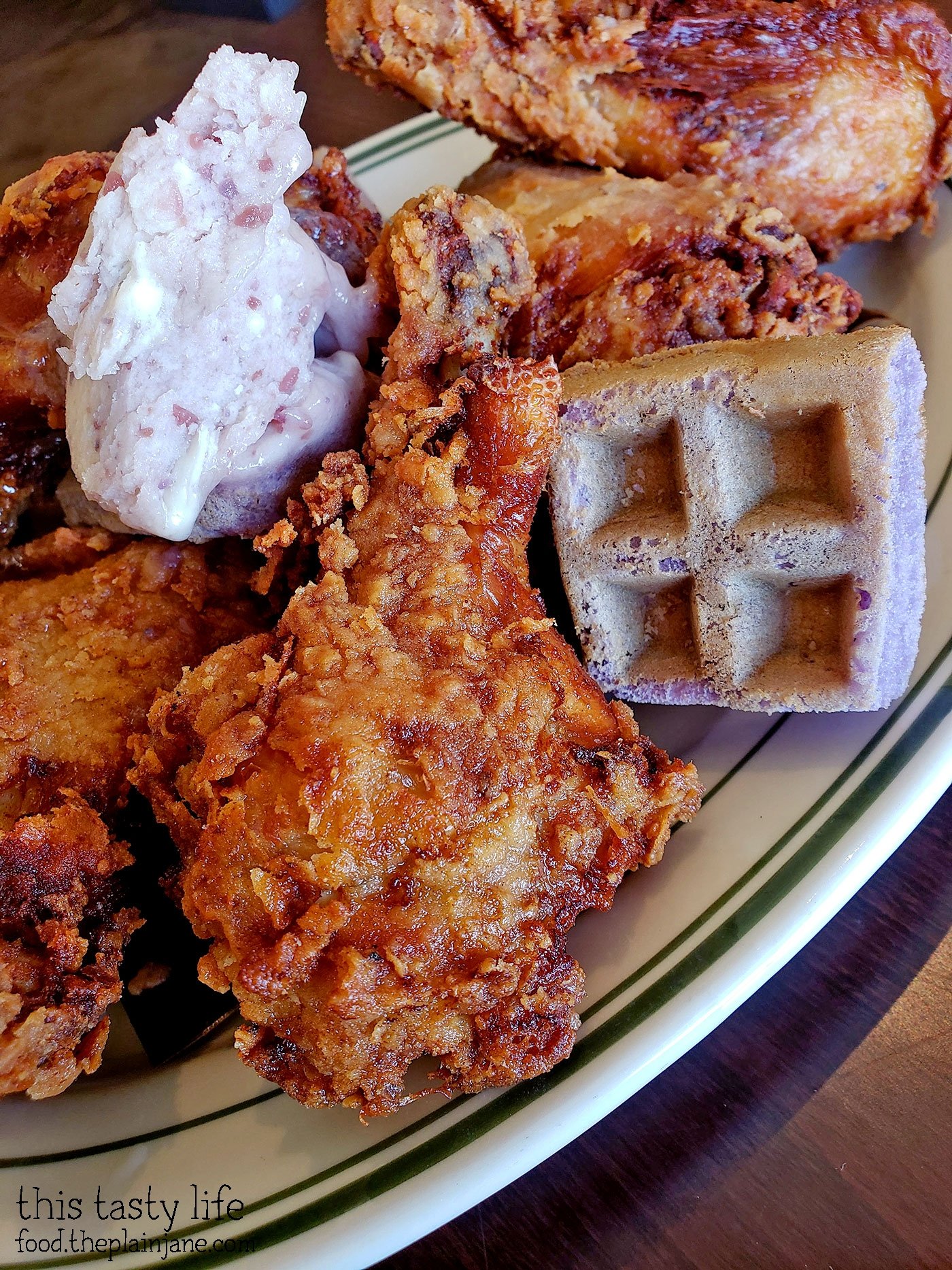 We ordered two entrees to share and they were both huge! The first entree from Gaya Gaya was the Adobo Fried Chicken [$21] which comes with Ube waffles.