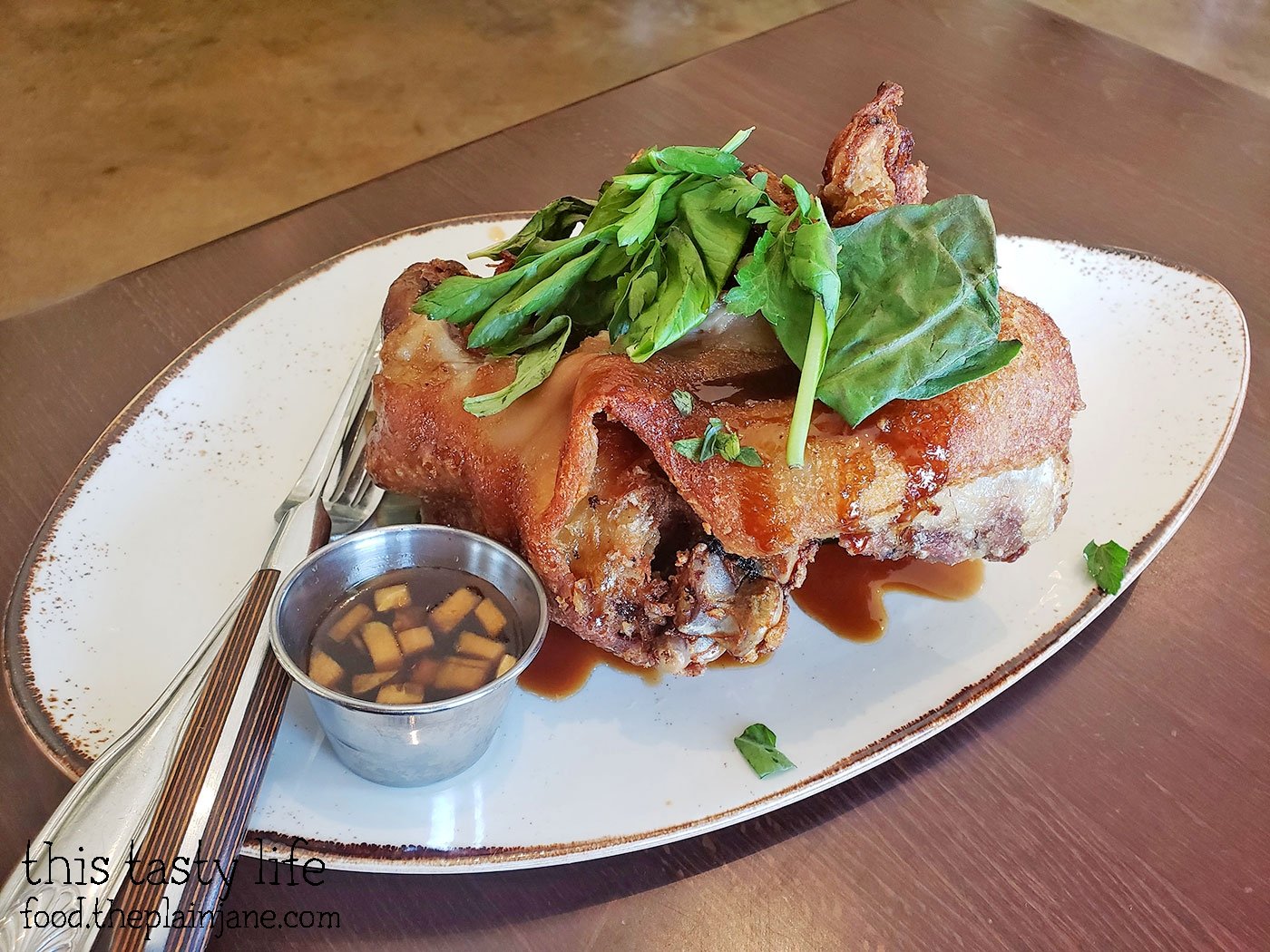 The second dish we tried at Gaya Gaya was the Crispy Pata [$19]. Crispy pata is a pork leg that involves boiling and then deep frying the pork. It creates this crazy crispy skin on the outside. CC and I weren’t totally sure of the greens on top but we think it was maybe some parsley on top.
