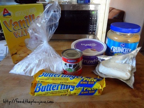 Last week I was planning on making dinner (macaroni and cheese — oh, I’ll have to post that one next week) and was asking Jake if he thought I should make dessert, too. He’s not a dessert person so he just kind of shrugged his shoulders at me. I decided it was better to ask Chris, our out of town friend, what he thought. He was much more receptive to the idea. Chris mentioned something about butterfingers and Jake then mentioned a pie, so butterfinger pie came up to the plate. See, I don’t even think of these things myself sometimes.