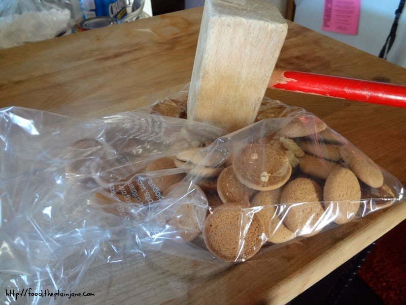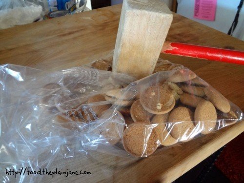 I decided I wanted to do this pie with vanilla wafers. You can also do an Oreo crust, graham cracker crust, or buy a premade shell. I put the wafers in a plastic bag and started to bang away on them until they were smooth crumbs.