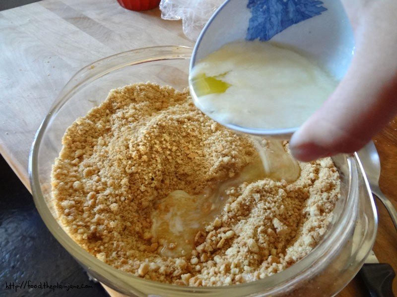 Add a tablespoon of sugar and six tablespoons of melted butter. Press it into a pie pan. I decided to bake mine for about 10 minutes at 350 degrees just to set it up a little, but you don’t really need to do that.