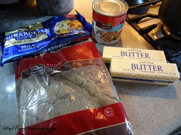 Brown sugar, butter, and condensed milk is what you need for the caramel goo. The chocolate chips are for later.